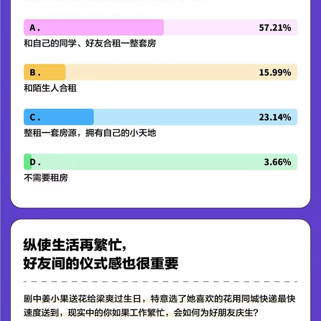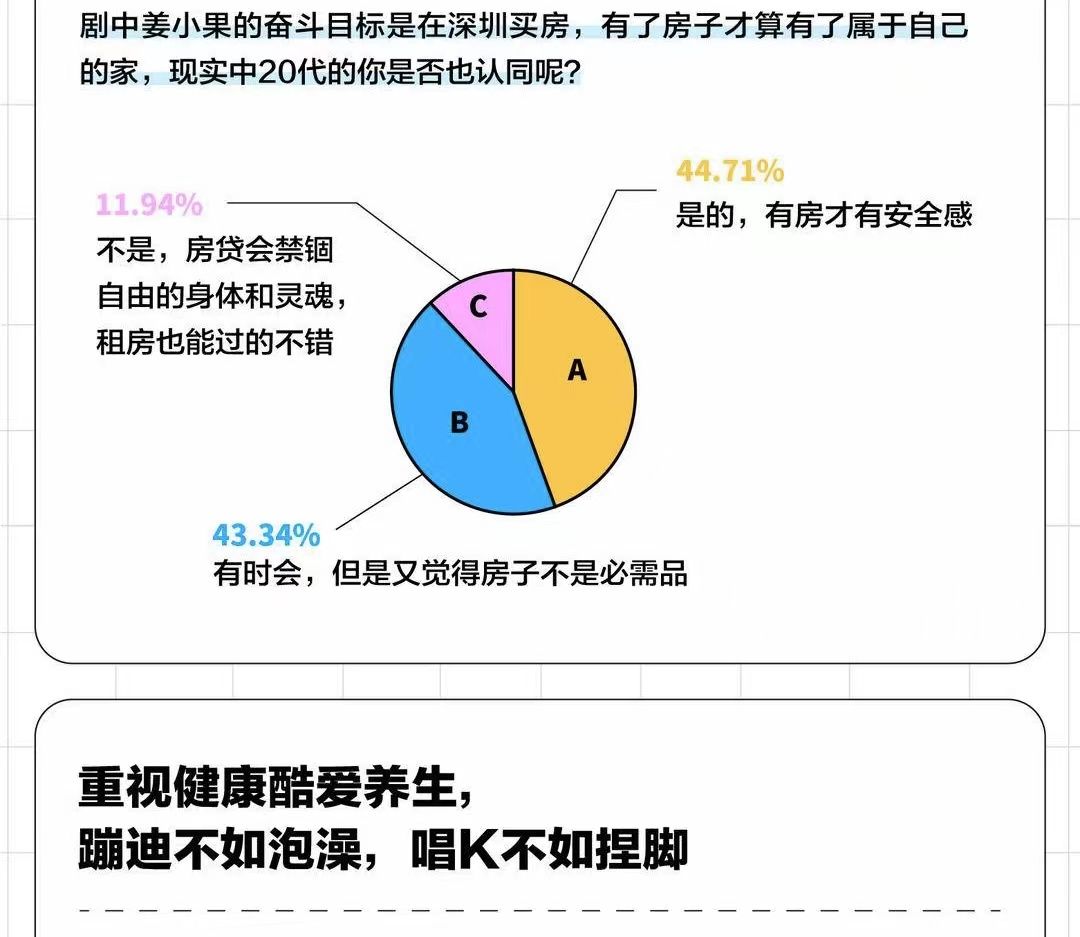 姜小果的奋斗目标是在深圳买房,有了房子才算有了属于自己的家,现实中20代的你是否也认同呢?44.695%表示认同,43.375%的人认为“有时会,但是又觉得房子不是必需品”,但也有11.93%选择不会,“房贷会禁锢自由的身体和灵魂,租房也能过的不错”。