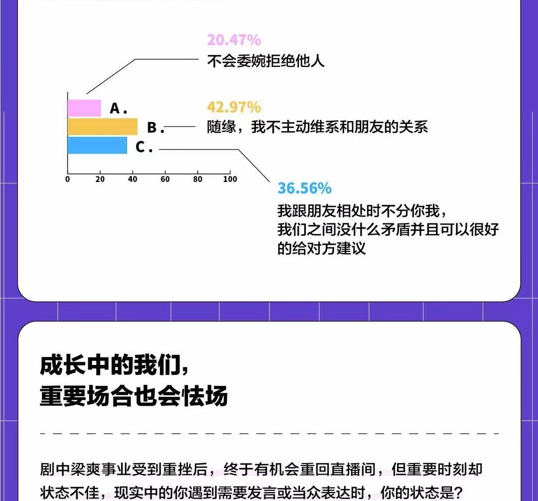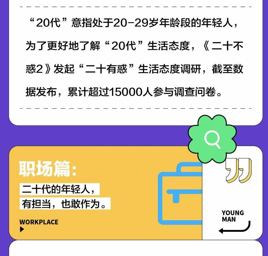 一份“二十代生活态度调研问卷”以20-29岁的人群数据调查,呈现了“二十代”人群在面对职场、爱情、友情、成长等困惑时的“态度面面观”。 从数据上看出,“二十代”是一群鲜活勇敢的年轻人,他们有着自己的生活节奏,有着自己所坚定的答案,就像正在热播的《二十不惑2》中的梁爽、姜小果、段家宝、丁一煊等人一样,为了生活勇敢拼搏,坚定内心选择,在通往未来的路上,勇敢试错,不留遗憾。