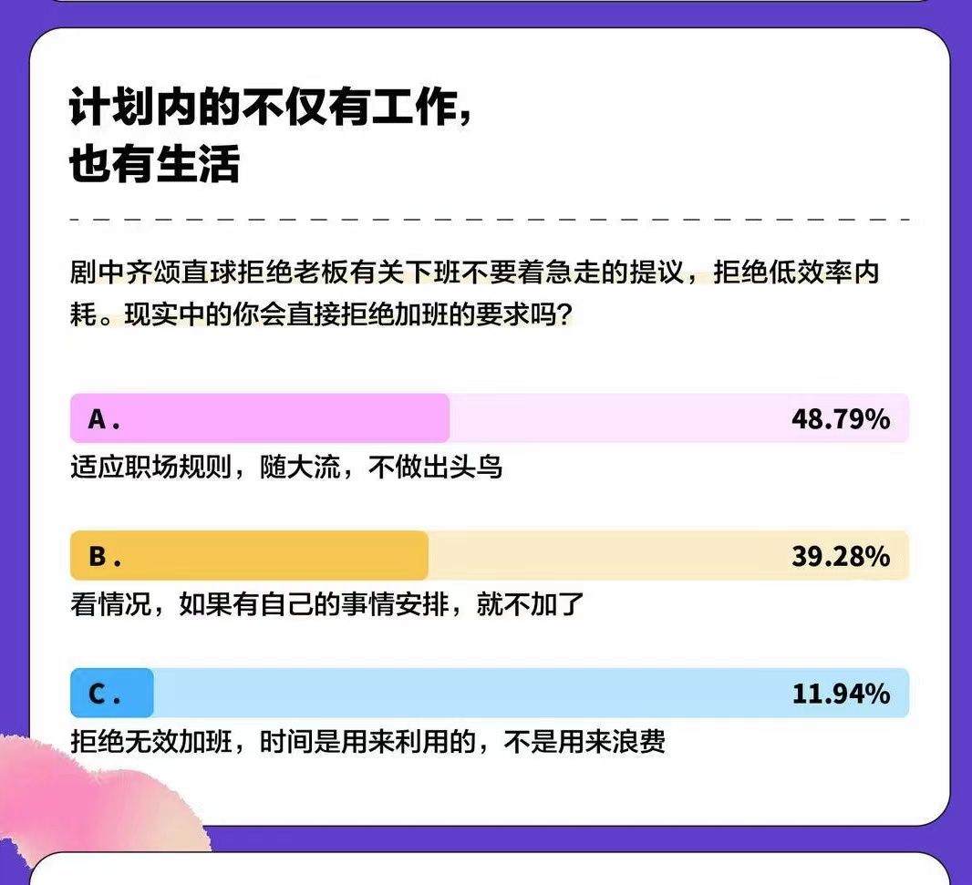 从网友所选答案来看,48.848%的网友选择适应职场规则,随大流,不做出头鸟,也有39.252%选择“看情况,如果有自己的事情安排,就不加了”,只有11.899%的人选择“拒绝无效加班,时间是用来利用的,不是用来浪费的”,看来大多数人还是理性按照打工人的职场法则走。