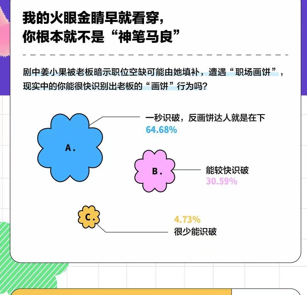剧中姜小果被老板暗示职位空缺可能由她填补,遭遇“职场画饼”,现实中的你能很快识别出老板的“画饼”行为吗?对此,64.732%的网友“一秒识破,反画饼达人就是在下”,30.57%的人能较快识破,很少能识破的只占4.698%。