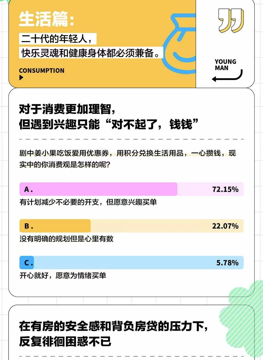 从消费观来看,剧中姜小果吃饭爱用优惠券,用积分兑换生活用品,一心攒钱,现实中的你消费观是怎样的呢?面对这个问题,73.982%的年轻人选择“有计划减少不必要的开支,但愿意兴趣买单”,19.994%的人“没有明确的规划但是心里有数”,只有6.023%的人任性表示,“开心就好,愿意为情绪买单”。