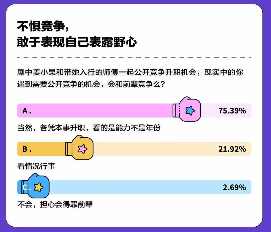 现实中的你遇到需要公开竞争的机会,会和前辈竞争么?面对小果的难题,76.577%的网友选择“会”,毕竟各凭本事升职,看的是能力不是年份。有20.801%的人选择“看情况行事”,而选择“不会,担心会得罪前辈”的,只有2.622%。