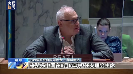 巴西常驻联合国副代表 小阿尔梅达:我想简单说两句,主席先生,来赞扬中国在8月成功担任安理会主席,而且一个月让我们不用打领带,谢谢。
