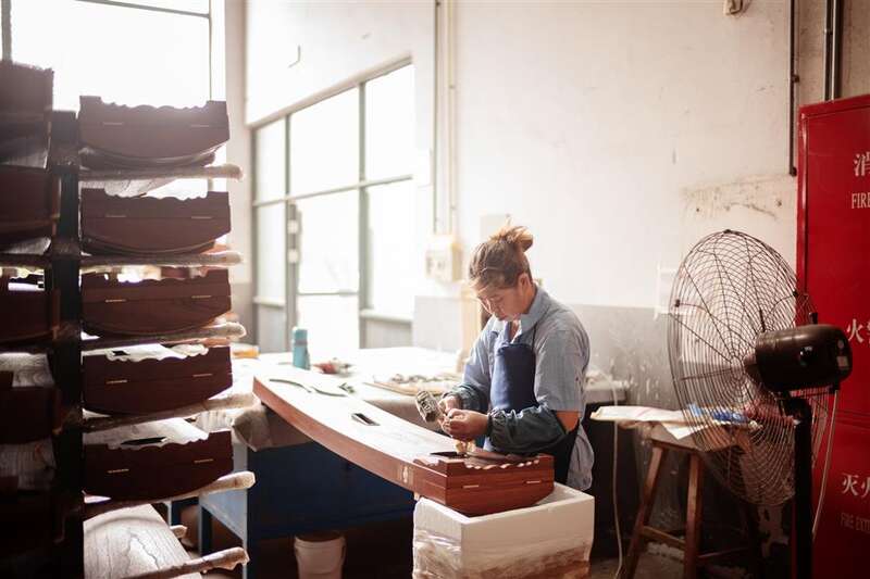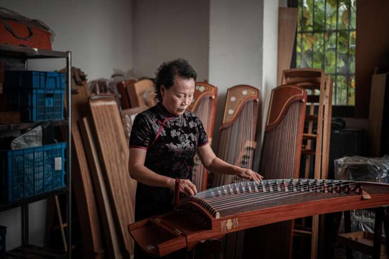 在车间里穿梭,李素芳44岁的徒弟徐仲荣说得最多的是“不”:这个不许拍,那个也不许拍。那些刚生产好还未对外公布的新品,那些联名定制款,那些正在研发的新型古筝,全都是藏在车间里的机密。