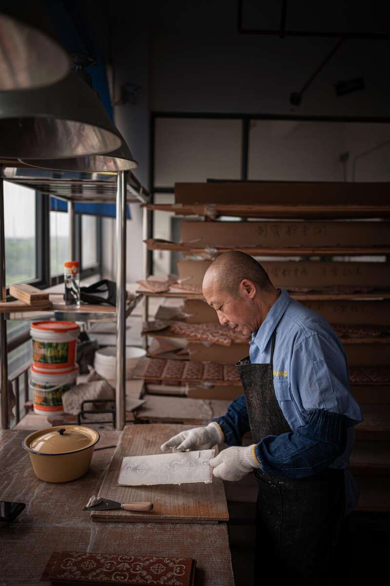 于是,徐振高天天去城隍庙,在雕梁画栋间寻找灵感,并跟雕刻师傅探讨,设计出新图样。“双鹤朝阳就是我师父原创的图样,还有荷花、龙凤等,在上世纪70年代看来,十分前卫。他的很多图样我们沿用至今,只是现在借助机器,比之前的雕刻更精细了。”李素芳说。