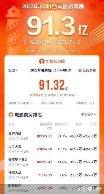 三个月内,115部影片先后上映,2022年电影暑期档于8月31日进入最后一天。据灯塔专业版数据,截至8月31日21时,今年暑期档共报收票房91.3亿元,较2021年增长近20亿元,观影人次也同比增长15%。票房与观影人次的双增,显现出电影市场正进一步复苏,而《独行月球》《人生大事》两部电影的热映,不仅包揽暑期档半数票房,也带动了市场热度,并再次证明了电影市场的空间从未消失,而是需要优质作品来激发观众及市场对于电影的需求。