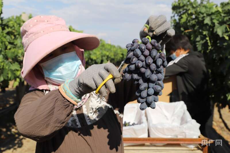 包装工人正在采收葡萄(央广网发 加亚巴图 摄)