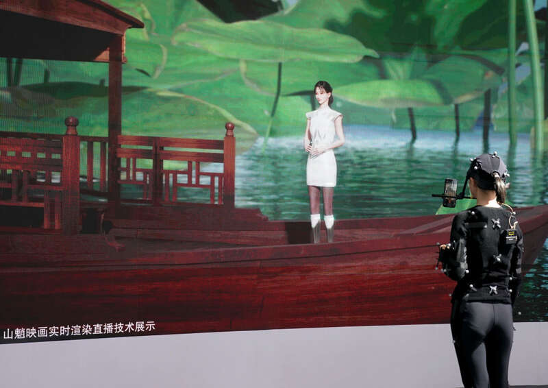 ↑9月1日,参展人员在服贸会首钢园区文旅服务展馆展示一款映画实时渲染直播技术。