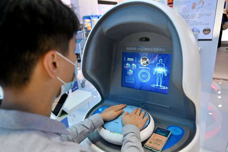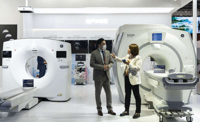↑9月1日,在国家会议中心一处医疗设备展台,工作人员在介绍医疗设备情况。
