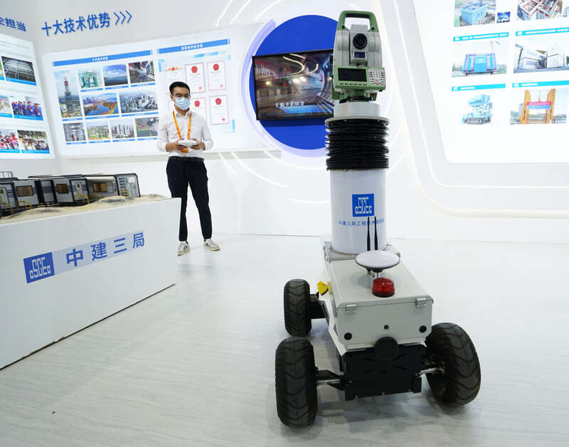 ↑9月1日,在2022年服贸会首钢园区,工作人员展示道路工程移动式高精度测量机器人。
