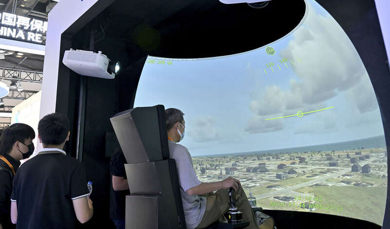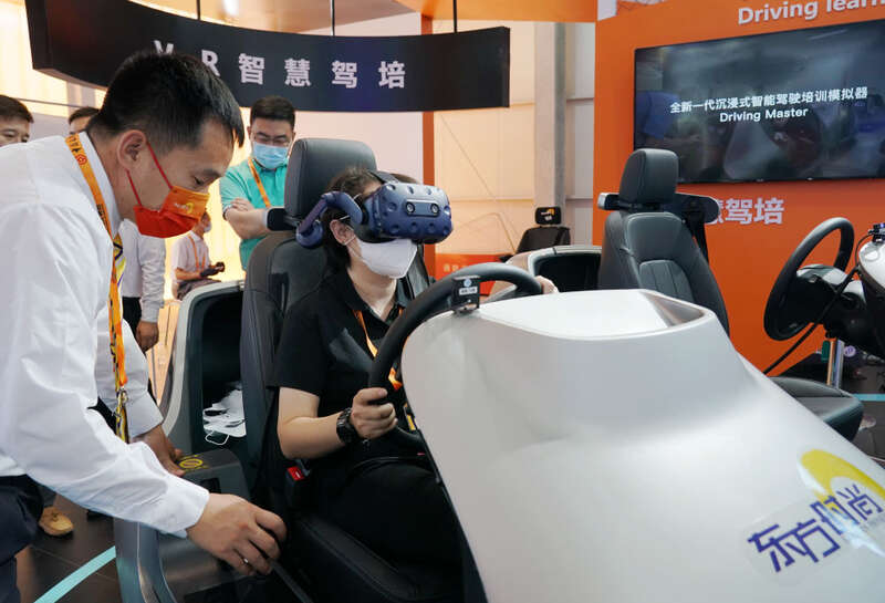 ↑9月1日,参观者在服贸会首钢园区展馆内体验一款VR智慧驾驶培训设备。