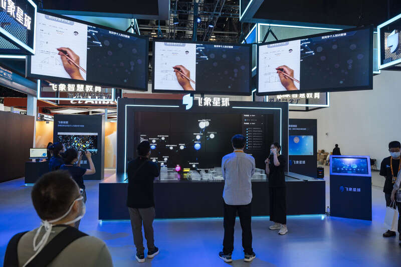 ↑9月1日,在国家会议中心,观众在参观飞象星球展台。