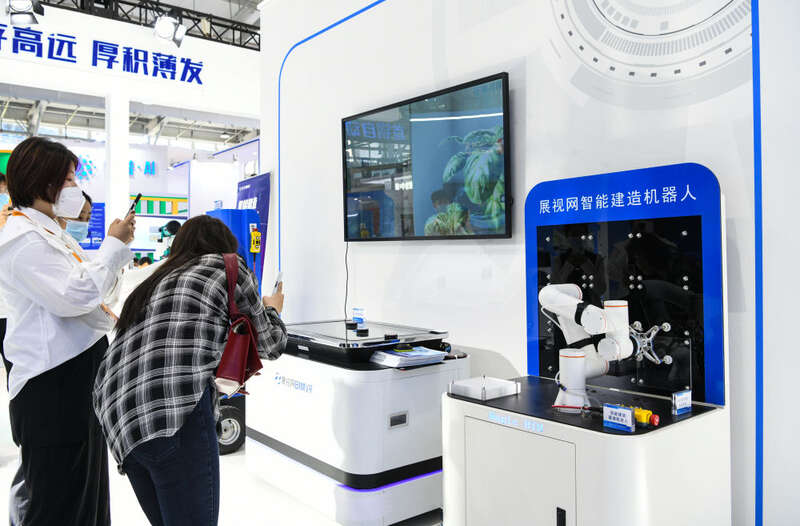 ↑9月1日,在2022年服贸会首钢园区,观众在参观智能建造机器人。