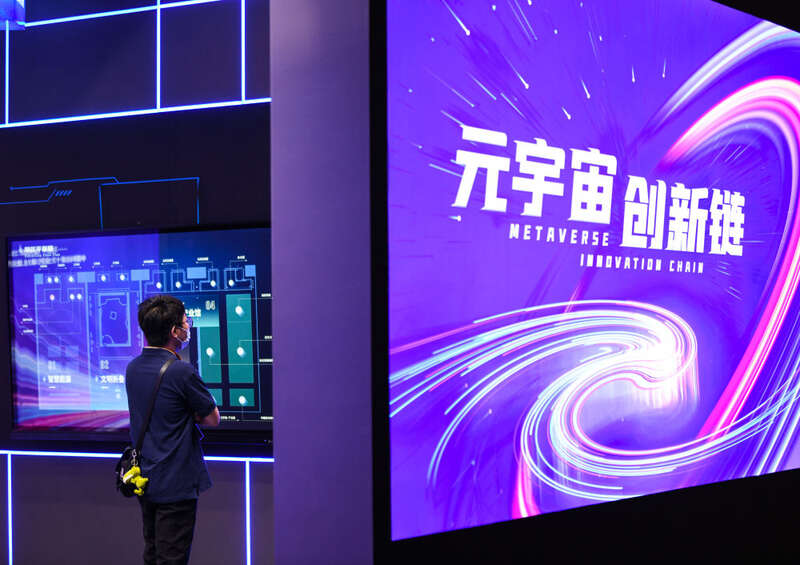↑9月1日,在2022年服贸会首钢园区,参观者在了解元宇宙创新链和产业链技术成果。