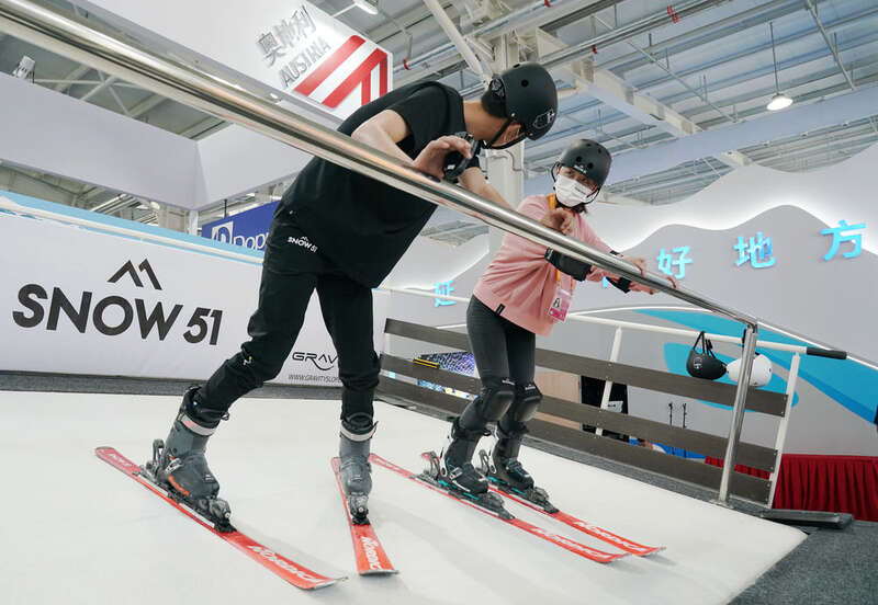 ↑9月1日,参会的媒体记者(右)在服贸会体育服务展馆内体验一款滑雪模拟设备。