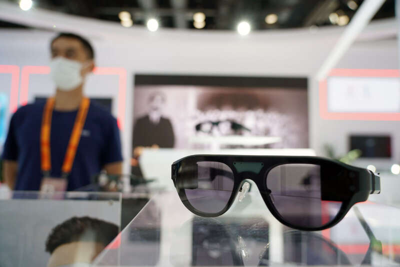 ↑9月1日在国家会议中心拍摄的在2022年服贸会上展出的一款AR字幕眼镜。