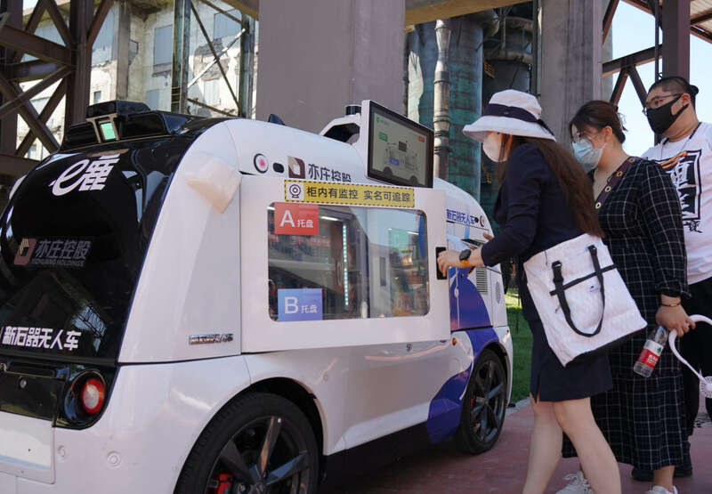 ↑9月1日,在服贸会首钢园展区,观众在体验无人零售车购物。