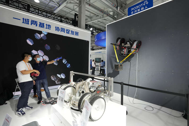 ↑9月1日,在服贸会首钢园展区,参观者在参观一款水射流清理机器人。
