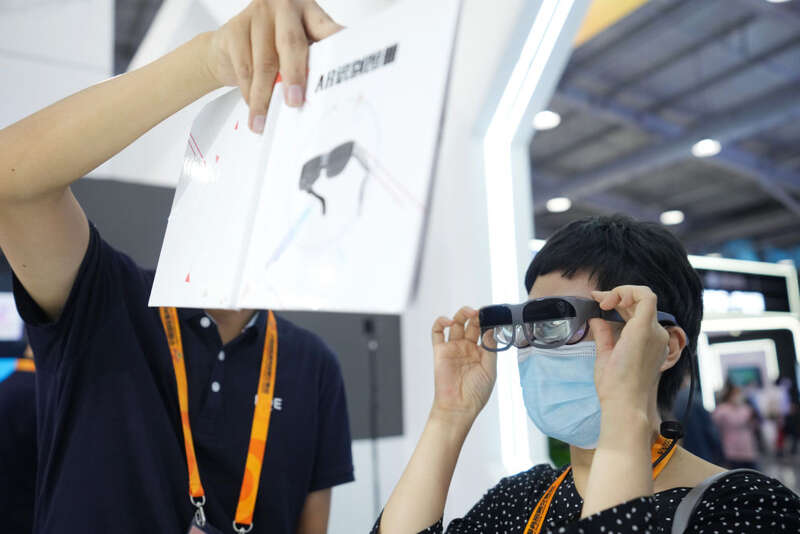 ↑9月1日,在服贸会首钢园展区电信、计算机和信息服务专题展馆,参观者体验一款增强现实(AR)眼镜产品。