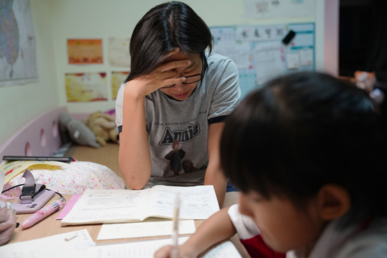 7月4日,北京,期末考试前夕,米娜检查女儿然然的数学作业。