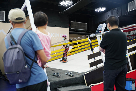7月25日,北京一所室内滑雪馆内,马骏(右)在场外看着女儿谦谦训练。