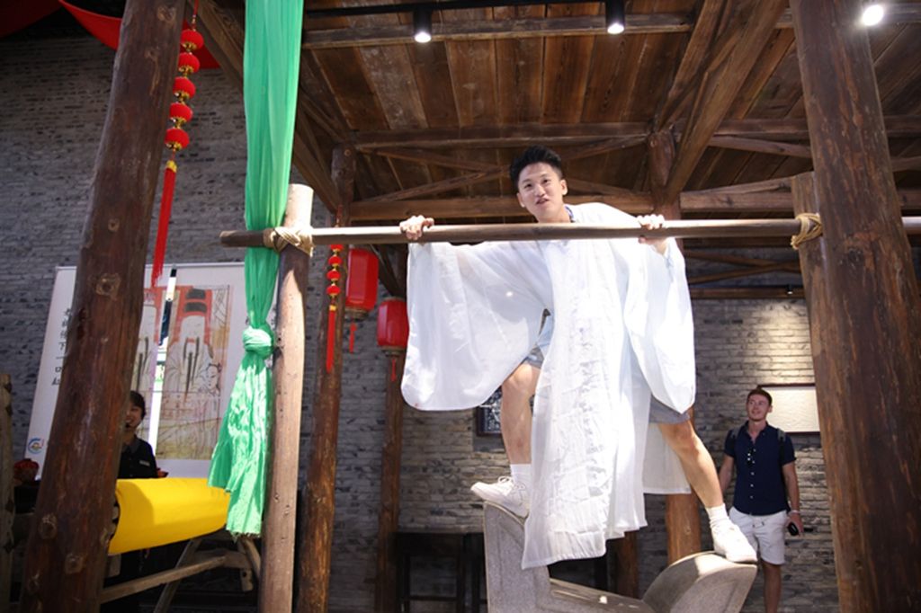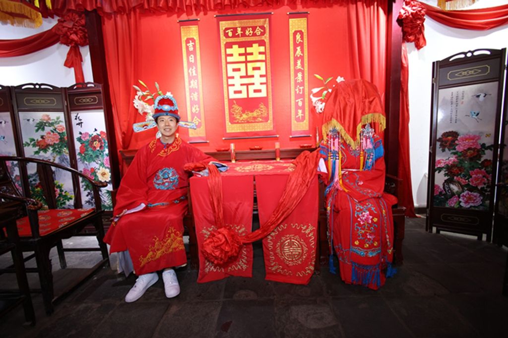 沿街向前,在一处两层阁楼小院里,民俗婚礼活动“抛绣球”正在上演。身着红色婚服的新娘从阁楼上抛下绣球,引来一阵“争抢”,最后花落“峻范”家——韩国视频博主金峻范幸运地接到了绣球。喜笑颜开的他被簇拥着换上新郎红袍,牵手“新娘”,亲身“体验”了一次中国式古代婚礼。
