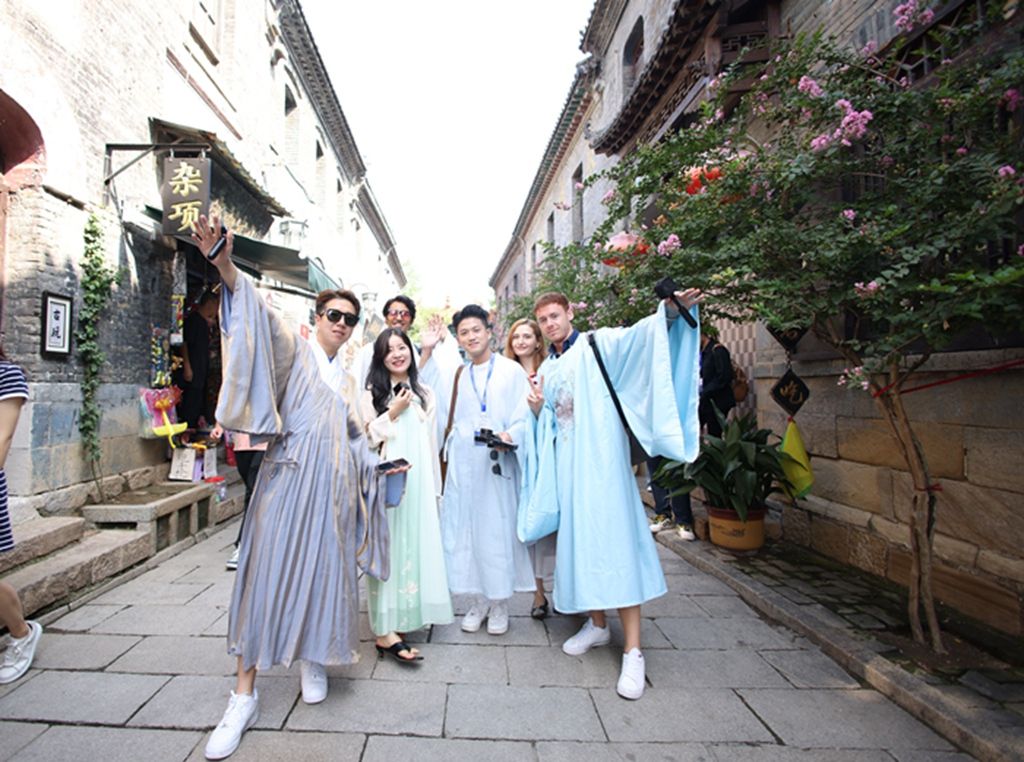 国际在线报道(王诗缘 黎萌):9月1日,2022“打卡中国·最美地标——你好,山东!”网络国际传播活动走进淄博,来到淄博周村古商城,外国视频博主身着汉服,在老街巷和古建筑中徜徉,沉浸式体验周村古商城独特的历史文化风貌。