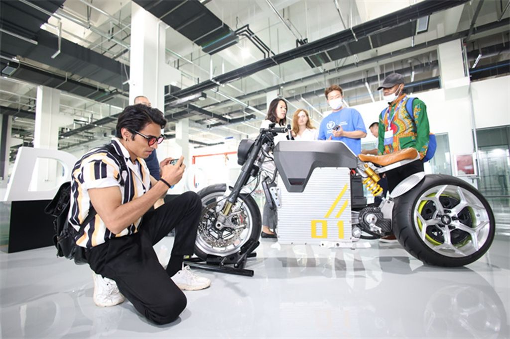 在伍柒区车业(淄博)有限公司车间内,酷酷的外观,科技感、动感十足的电动摩托车吸引了外国视频博主的目光。