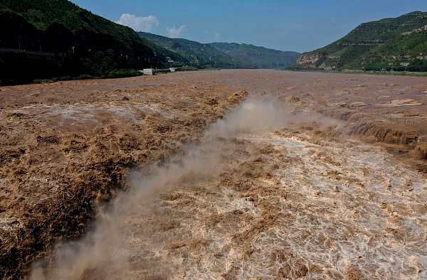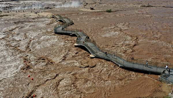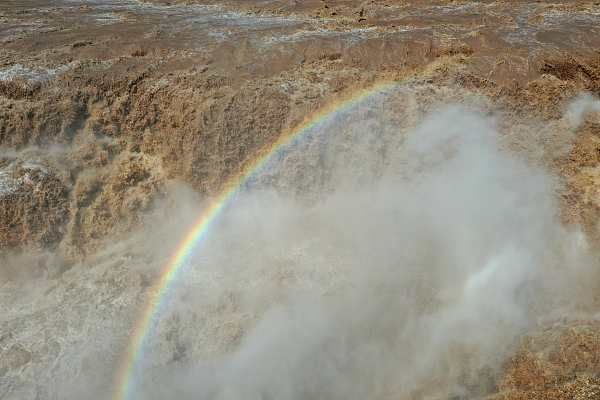 2022年9月1日,山西临汾,吉县黄河壶口瀑布迎来秋汛。近日,受上游降雨和水库调节放水影响,黄河干流迎来秋汛,晋陕峡谷水量大涨,壶口瀑布主副瀑布连成一线,奔腾咆哮的黄河水翻滚而下,飞溅起一团团水雾,在阳光的照射下,形成了一道美丽的彩虹,吸引了不少游客驻足观看。