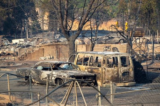 当地时间9月3日,被“磨坊之火”(Mill Fire)烧毁的房屋和车辆。