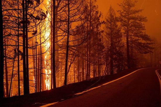 当地时间9月3日,美国加州山火肆虐,一棵树在燃烧。