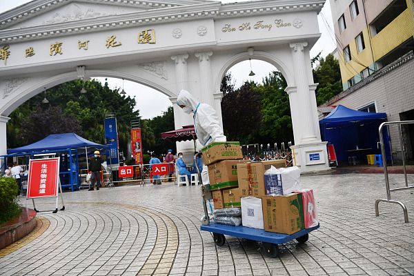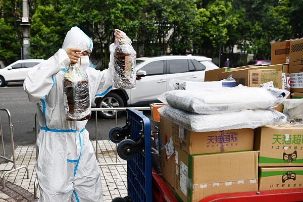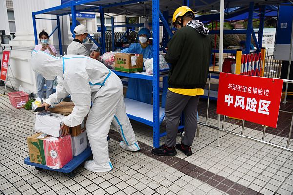 2022年9月3日,成都市一处被划定为中风险区的小区门口,快递员在做好防护措施的情况下将物品放到货架上,再由社区工作人员转送给小区居民。目前,为保障各个中风险区域居民的日常生活,成都快递业务正常运营。 中新社记者 张浪 摄