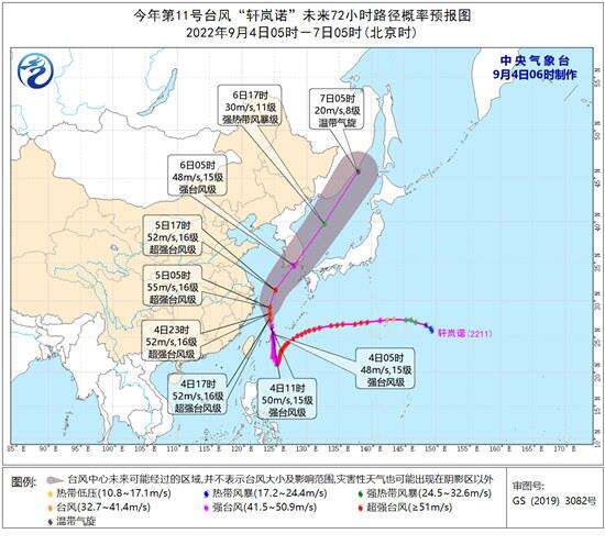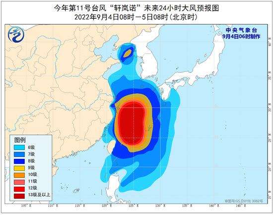 中央气象台预计,今天“轩岚诺”将以每小时15-20公里的速度向北偏西方向移动,强度将逐渐加强,最大强度可达超强台风级(16级,52-55米/秒),并逐渐向浙江东北部近海靠近,今天夜间到明天早晨将在浙江近海海面北上,明天上午开始转向东北方向移动,趋向朝鲜半岛南部到朝鲜海峡一带。