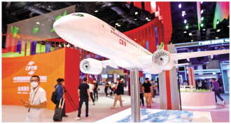 图为2022年中国国际服务贸易交易会国家会议中心展区现场。多位记者在C919客机模型旁观看拍照。 CFP供图