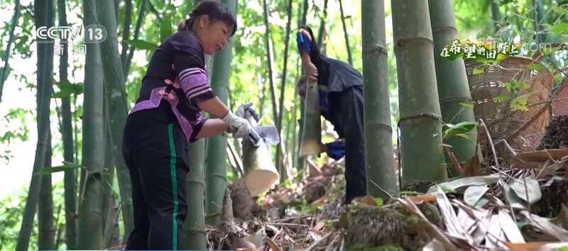 总台记者 张卉:我现在所在的位置就是田林县六隆镇的八渡笋万亩竹海,现在正是竹笋收获的季节,在现场我们可以看到,村民们正在忙着采收。六隆镇是八渡笋的主产区,现在全镇有18个村都在种植八渡笋,以前因为竹林的老化衰退,八渡笋的产量和产值明显下降。这几年,当地经过低产林改造之后,像我手里这样的八渡笋的亩产达到1500斤左右。