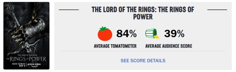 这反而引起了更大的反弹。当下的互联网,最不缺的就是点评网站。截至北京时间9月5日,在烂番茄上,《力量之戒》呈现明显的剧评人与普通观众的分歧,84%的剧评人认可该剧,但只有39%的普通观众认可该剧。