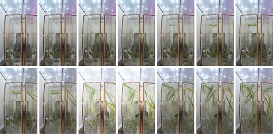 实验启动后,高秆和矮秆水稻种子奋力生长,但不出所料,它们在微重力的空间环境中遭遇“水土不服”,患上了“航天综合征”。长出的水稻幼苗看起来有些“懒散”,并没有像地面上的水稻那样精神抖擞地挺立起来,而是“趴”在了透明实验盒子的壁上。