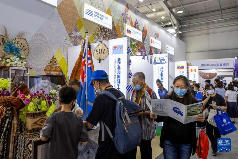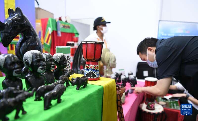9月4日,参观者在首钢园区津巴布韦展台了解特色产品。