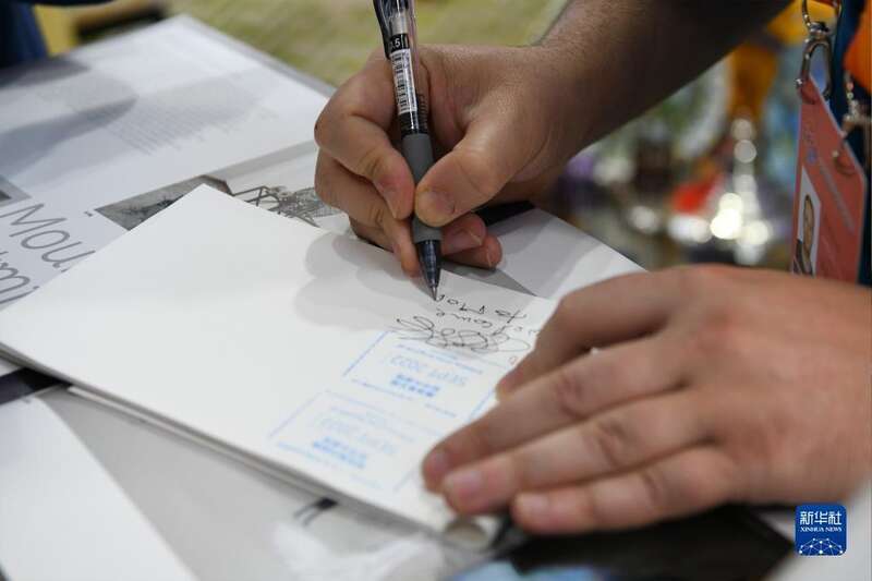 9月4日,在首钢园区,摩洛哥展台工作人员为观众盖纪念章并签名。