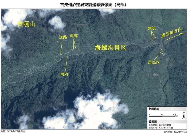 为尽快掌握地震灾害情况,为前线应急救援指挥提供一手参考资料,四象科技第一时间通过中国资源卫星应用中心订购了高分三号合成孔径雷达卫星(简称SAR卫星)影像数据,通过自有遥感信息综合处理应用平台对影像进行导入、滤波和增强等处理,对泸定地震灾区进行受灾情况遥感分析与评估。通过影像信息判读可以发现,海螺沟景区有多处山体滑坡,部分滑坡倾倒至河流,并已导致部分道路中断。