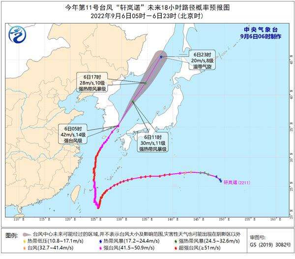 大风预报:9月6日08时至7日08时,东海东北部、黄海中东部和东南部有6—7级大风,阵风8—9级;我国东北地区东北部有4—5级风,阵风6—7级,局地8级。朝鲜海峡、日本海大部有8—11级大风,“轩岚诺”中心经过的附近海面的风力有12—14级,阵风可达15—16级。