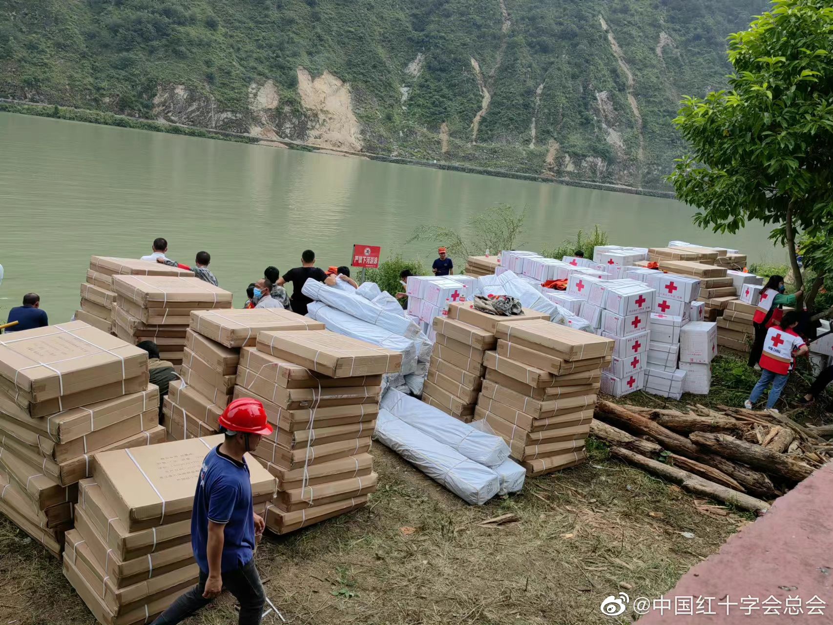 9月6日上午,雅安市红十字会12名赈济救援队队员携带10顶帐篷渡河前往灾情较严重的王岗坪乡。抵达王岗坪乡后,队员们迅速将携带的10顶帐篷搭好,全力支持当地抗震救灾工作。