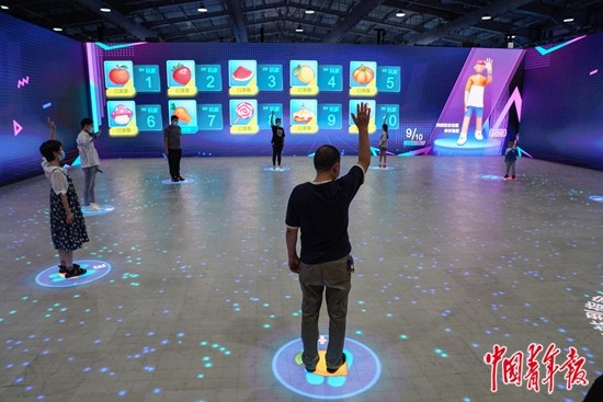 9月4日,2022年服贸会首钢园展区元宇宙体验馆,参观者和屏幕里的虚拟形象一起举手示意准备完毕,体验无需穿戴设备就能捕捉动作进行人机交互的沉浸式游戏。已步入第10年的服贸会,今年首次以“元宇宙产业”为主题设立了专业展馆,元宇宙和虚拟现实、增强现实等概念成为最热关键词。