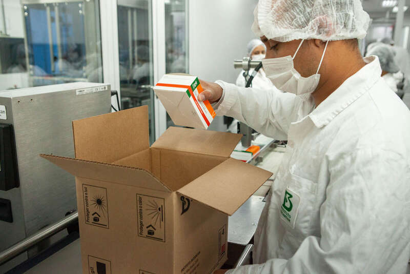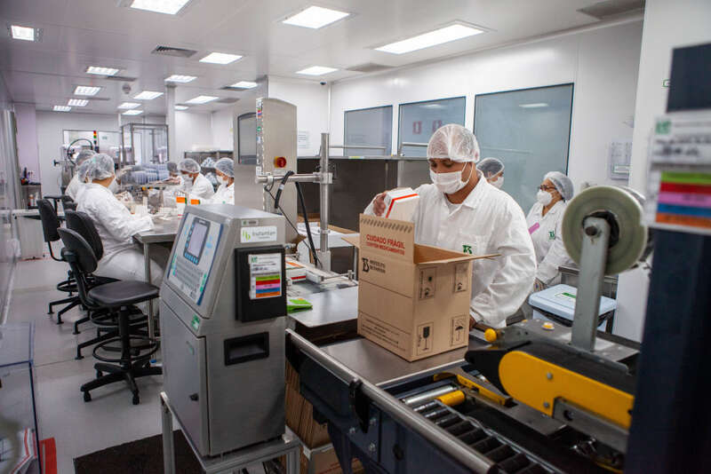 ↑这是2022年8月31日,工作人员在巴西圣保罗州布坦坦研究所将新生产的克尔来福新冠疫苗装盒。