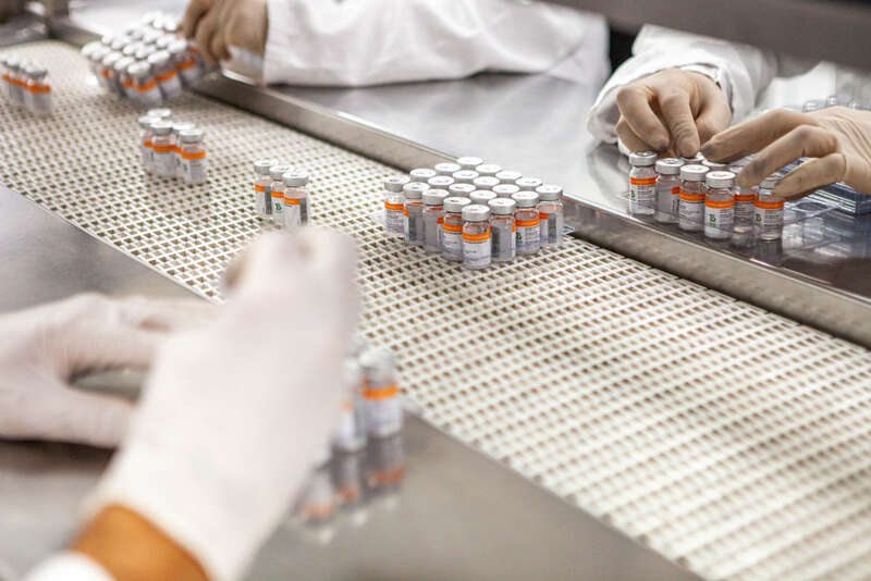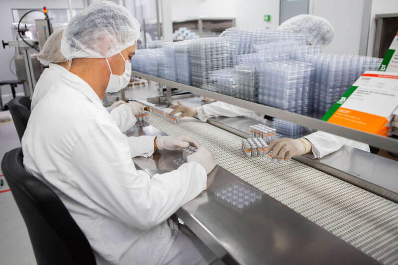 ↑这是2022年8月31日,工作人员在巴西圣保罗州布坦坦研究所的克尔来福新冠疫苗生产线上工作。