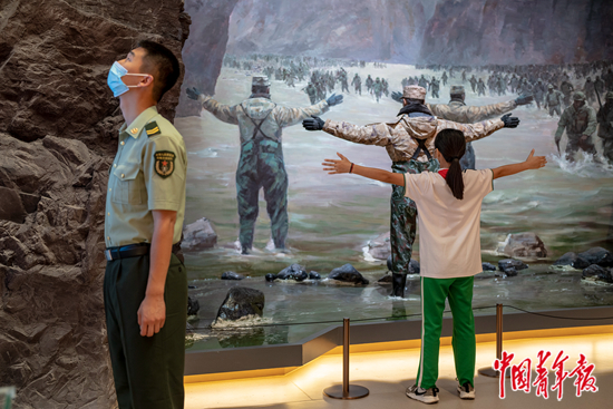 在展厅出口处的“国防和军队现代化新‘三步走’战略”展墙前,一名年轻的战士庄严敬礼,请战友帮自己拍下照片。另一处“奋斗强军”军人群体主题雕塑前,一个孩子同样在镜头前敬礼致意。他对面的主题雕塑中,三军将士列队前行,“八一”军旗在空中高高飘扬。