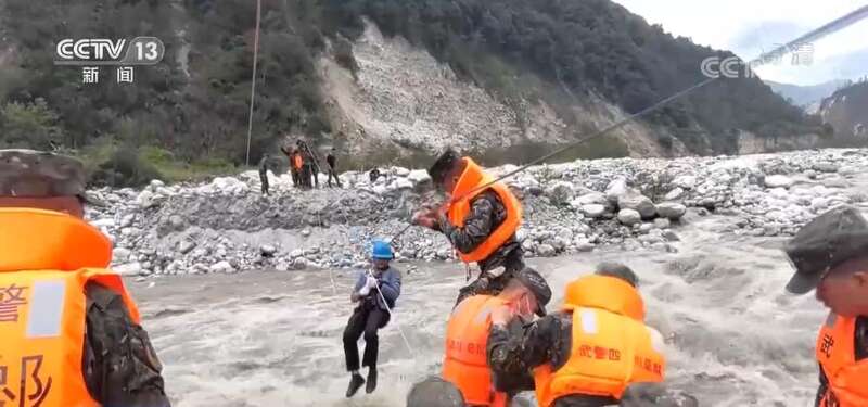 位于震中附近磨西镇燕子沟一侧的共和村,因道路、桥梁中断,地震后一度成为“孤岛”。9月6日上午,当救援人员抵达共和村对岸时,湍急的燕子沟河成为救援队最大的阻碍。救援人员选定一处河道约10米宽的地方搭建水上索道。