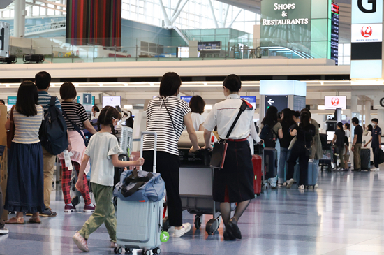 9月5日,日本东京,旅客在羽田机场国际航站楼办理登机手续。尽管疫情严重,日本仍决定从9月7日起放宽防疫措施,每日入境人数上限从目前的2万人提高到5万人。视觉中国供图