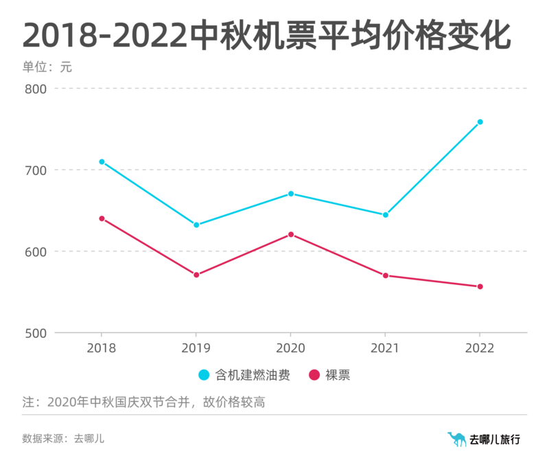 中国青年报客户端北京9月8日电(中青报·中青网见习记者 赵安琪)为期三天的2022中秋小长假即将来临,去哪儿平台今天发布的数据显示,今年中秋机票国内支付订单平均裸票价格(不含机建燃油附加费)为556元,为近5年来最低。