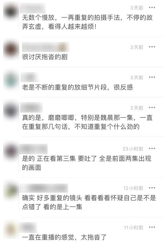 用力过猛另一个鲜明的标志是,剧集一再出现重复性桥段,上一集刚播完这个桥段,下一集冷不丁又播了一遍,个别镜头甚至出现三四遍,以至于有观众吐槽:以为自己看错集数了。重复剪辑为的是揭示不同的信息量,这个意图固然可以理解,可惜的是,相同桥段换个机位重复播放是比较笨拙的手法,因为找不到更高效的传递信息的方法,主创者只能冒着稀释节奏、降低叙事效率的风险,换个机位、加点台词播放已经播过的桥段。而且,这个三板斧用得过于频繁了,第三集过后几乎每一集都要来一点重复剪辑,其结果是五集过后,叙事几乎没有什么实质性的推进。